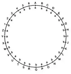 A = aaaaa B = aaaab C = aaaba D = aaabb E = aabaa F = aabab G = aabba H = aabbb I/J = abaaa K = abaab L = ababa M = ababb N = abbaa O = abbab P = abbba Q = abbbb R = baaaa S = baaab T = baaba U/V = baabb W = babaa X = babab Y = babba Z = babbb