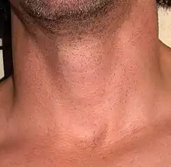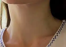 W linii pośrodkowej, poniżej brody da się wyczuć kość gnykową, poniżej której znajduje się wyniosłość chrząstki tarczowatej zwana jabłkiem Adama, zaznaczająca się lepiej u mężczyzn niż u kobiet. Jeszcze niżej wyczuwalna jest chrząstka pierścieniowata, a pomiędzy nią a wcięciem nadmostkowym może się uwypuklać tchawica i przesmyk gruczołu tarczowego. Na bocznej stronie szyi najbardziej charakterystyczny jest zarys mięśnia mostkowo-obojczykowo-sutkowego, który oddziela przedni trójkąt szyi od bocznego. W górnej części tego pierwszego leży ślinianka podżuchwowa, znajdująca się poniżej tylnej połowy trzonu żuchwy. Przebieg tętnicy szyjnej wewnętrznej i zewnętrznej można wyznaczyć przedłużając wypukłość mięśnia mostkowo-obojczykowo-sutkowego do kąta żuchwy.