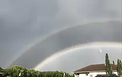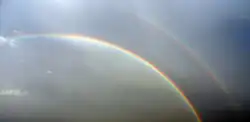 Czasami można zaobserwować drugą (wtórną) mniej jasną tęczę, znajdującą się na zewnątrz tęczy właściwej. Tęcza wtórna tworzy łuk o kącie widzenia 50–53° i powstaje w wyniku dwukrotnego odbicia światła wewnątrz kropli wody. Ponieważ odbicie zachodzi dwukrotnie, a różnice w kącie rozproszenia światła w zależności od miejsca padania światła na kroplę są większe, tęcza wtórna jest mniej intensywna i szersza od tęczy pierwotnej[6].