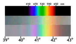 Dyspersja jest rosnącą, ale nie liniową funkcją kąta padania światła dla kątów padania, które tworzą tęczę, dyspersja niemal nie zależy od kąta padania światła[4].