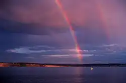 Jeszcze inne odmiany tęczy można dostrzec, gdy światło odbija się od lustra wody, zanim zostanie rozszczepione przez krople deszczu. Dochodzi wtedy do powstania tęczy odbiciowej. Promienie słoneczne po odbiciu od poziomej powierzchni, np. wody tworzą tęczę, tak jakby źródło światła było odbiciem źródła światła w wodzie; wówczas środek łuku tęczy jest odbiciem środka łuku tęczy i jest nad horyzontem. Tęcza odbiciowa jest jakby odbiciem w wodzie części łuku tęczy zwykłej, która byłaby pod horyzontem. Z tego powodu łuk tęczy odbiciowej leży powyżej normalnej tęczy, a przy horyzoncie obie tęcze spotykają się, wzmacniając się. Tęcza odbiciowa może występować zarówno dla pierwotnego, jak i wtórnego łuku. Na zdjęciu obok tęcza odbiciowa; słabo widoczny jest prawie pionowy łuk w pasie Aleksandra. Tęcza odbiciowa powstaje gdy, powierzchnia wody w miejscu odbicia się promieni słonecznych, które po załamaniu w kropli wody trafiają oka obserwatora, jest płaska. Dla górnej części łuku tęczy odbiciowej miejsce odbicia promieni od wody jest położone z tyłu za obserwatorem, a dla części tęczy przy horyzoncie – przed obserwatorem, w pobliżu kropel tworzących tęczę[27][28].