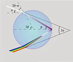 Kąt odchylenia promienia świetlnego, w zależności od liczby odbić k i kąta padania światła i na powierzchnię kropli, określa wzór, oraz jego postać po uwzględnieniu prawa Snelliusa[4]: