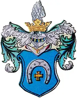 - W polu niebieskim podkowa barkiem do góry postawiona. W środku podkowy złoty krzyż. Labry niebieskie podbite srebrem i złotem.