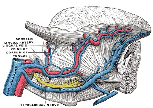 - tętnica podjęzykowa (łac. arteria sublingualis) – odchodzi przy przednim brzegu mięśnia gnykowo-językowego i jest przedłużeniem tętnicy językowej, która w tym miejscu zakręca ku górze. Tętnica podjęzykowa biegnie dalej poziomo i ku przodowi po dnie jamy ustnej, pomiędzy mięśniem bródkowo-gnykowym a mięśniem żuchwowo-gnykowym. Następnie tętnica biegnie równolegle do przewodu ślinianki podżuchwowej i pod ślinianką podjęzykową. Unaczynia ona dno jamy ustnej wraz z trzewiami (ślinianka podjęzykowa) oraz dziąsła zębów dolnych. Pod wędzidełkiem języka zespala się z tętnicą strony przeciwległej[1].