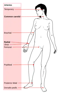 Dokonuje się go na tętnicach powierzchniowych, najczęściej tętnicy promieniowej, choć także na innych tętnicach dostępnych badaniu palpacyjnemu – tętnicy szyjnej zewnętrznej, ramiennej, udowej, podkolanowej, skroniowej i grzbietowej stopy. Jednak w trakcie resuscytacji Europejska Rada Resuscytacji w wytycznych nie zaleca sprawdzania tętna na tętnicach obwodowych (gdyż często w takich wypadkach dochodzi do centralizacji krążenia i tętno w nich jest niewyczuwalne), ale na tętnicach szyjnych, gdyż ze wszystkich wyczuwalnych przez skórę tętnic są najbliżej serca. Tętno bada się na tętnicy szyjnej ok. 1,5 cm bocznie od wyniosłości krtaniowej – stosuje się jedno określone miejsce aby zapobiec masażu zatoki tętnicy szyjnej przy próbie wyszukania miejsca badania tętna i niepożądanemu obniżeniu pracy serca.