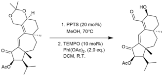 Ze względu na znaczną zawadę steryczną związaną z atakiem nukleofilowym alkoholu na sól oksoamoniową, alkohole pierwszorzędowe ulegają utlenianiu katalizowanym przez TEMPO dużo szybciej od alkoholi drugorzędowych. Pozwala to na przeprowadzanie chemoselektywnych transformacji pierwszorzędowych alkoholi w obecności alkoholi drugorzędowych[15]. Selektywność TEMPO w reakcji utleniania grup hydroksylowych została wykorzystana przez Danishefsky’ego i współpracowników w ostatnim etapie totalnej syntezy naturalnego diterpenoidu, guanakastepenu A[a]. W ostatnim etapie syntezy wcześniej otrzymany acetal odbezpieczony został za pomocą para-toluenosulfonianu pirydyny (PPTS, z ang. pyridinium para-toluenosulfonate), a następnie otrzymany pośredni diol utleniono chemoselektywnie do aldehydu za pomocą TEMPO w obecności PIDA, otrzymując guanacastepene A z wydajnością 65%[18][19].