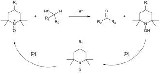 Utlenianie alkoholi katalizowane przez TEMPO zachodzi najczęściej poprzez sól oksoamoniową. Związek ten powstaje in situ w mieszaninie reakcyjnej pod wpływem utleniania TEMPO za pomocą właściwego utleniacza np. podchlorynu lub podbrominu sodu, albo związków jodu wykazujących właściwości utleniające, takich jak PIDA (z ang. iodobenzene I,I-diacetate – I,I-dioctan jodobenzenu) lub PIFA (z ang. iodobenzene I,I-bis(triflluoroacetate) – I,I-bis(trifluorooctan) jodobenzenu). Rodniki nitroksylowe mogą być stosowane w reakcjach utlenienia w ilościach katalitycznych. Pierwszym etapem takiego cyklu katalitycznego jest zwykle nukleofilowy atak atomu tlenu grupy hydroksylowej alkoholu na elektrofilowy atom azotu soli oksoamoniowej. Następnie w wyniku przegrupowania [2,3]-sigmatropowego uwalniany jest odpowiedni związek karbonylowy (aldehyd lub keton) i tworzy się hydroksyloamina. jest ona utleniana następnie do soli oksoamoniowej, co zamyka cykl katalityczny[15][16].