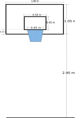 Tablica jest zawieszona 2,9 m od podłoża. Tablica ma wymiary 1,80 m x 1,05 m. Kosz jest umieszczony 15 cm od dolnej podstawy tablicy. Szerokość prostokąta, do którego jest doczepiony kosz wynosi 59 cm, a wysokość 45 cm[1]. Kosz jest umieszczony 15 cm od tablicy.