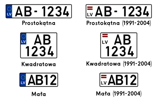 Łotewskie tablice rejestracyjne – nowe tablice rejestracyjne na Łotwie składają się z niebieskiego paska z lewej strony (eurobandu), na którym znajduje się flaga UE, a niżej kod samochodowy Łotwy „LV”. Reszta to dwie czarne litery oznaczające serię tablicy rejestracyjnej, myślnik i cztery cyfry.