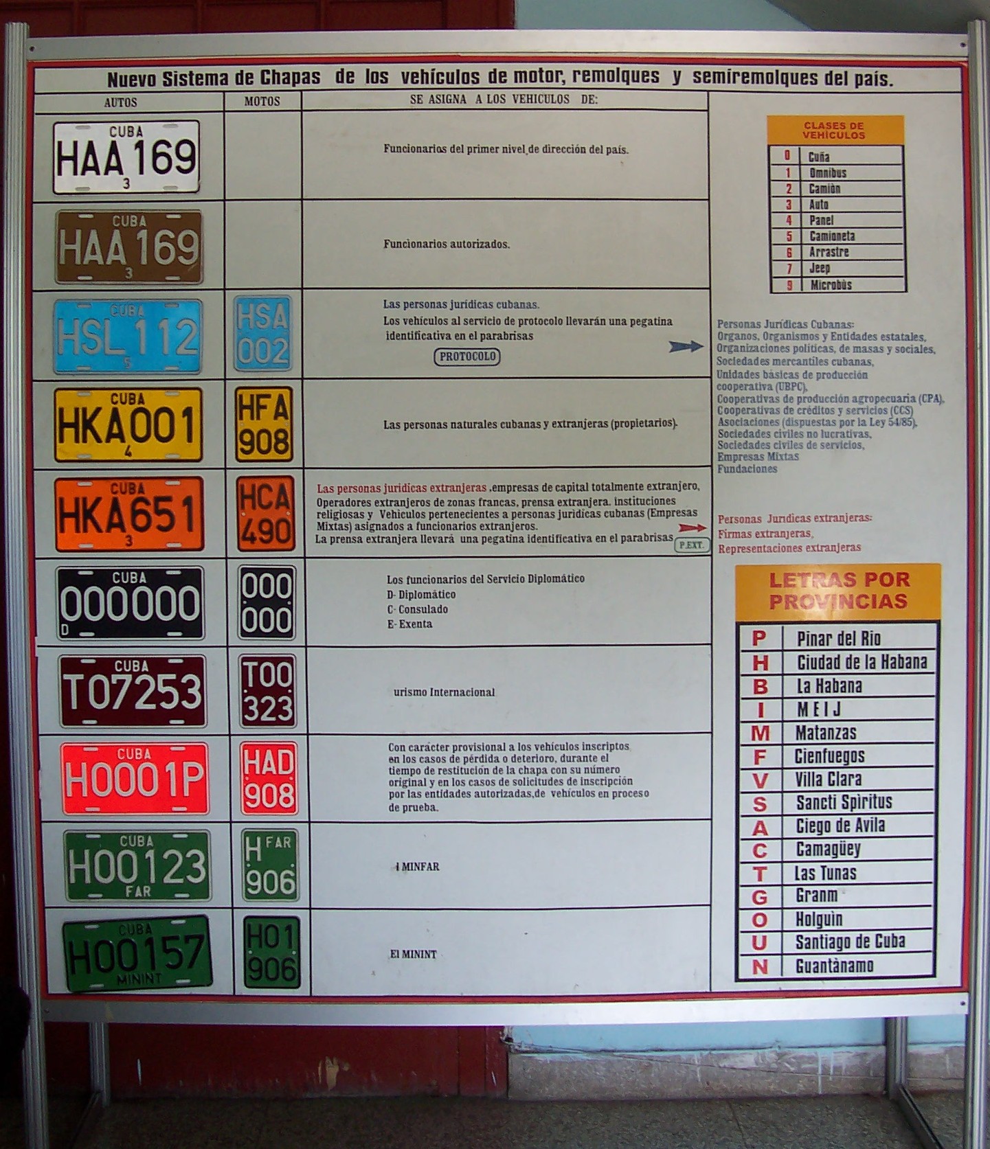 - ↑ Zestawienie rodzajów tablic wzoru 2002: http://www.cubanite.com/foto/TargheCubaneGrande.jpg