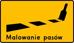 T-19: tabliczka wskazująca na malowanie znaków poziomych | Tabliczka umieszczana jest wraz ze znakiem A-14 roboty na drodze w czasie, gdy na drodze prowadzone są prace związane z umieszczaniem lub odnową znaków poziomych. | ||||||||||||||||||||