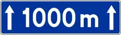 | T-1b: tabliczka wskazująca długość tunelu lub odcinek drogi do końca tunelu | Tabliczka stosowana ze znakiem D-37. Umieszczona przed wjazdem do tunelu o długości powyżej 500 m wskazuje jego długość. W tunelu o długości przekraczającej 3000 m umieszczana jest samodzielnie co 1000 m i wskazuje długość odcinka do końca tunelu. Należy tu dodać, że najdłuższy obecnie tunel drogowy w Polsce (Tunel drogi ekspresowej S2 w Warszawie) ma długość 2355 m. | |||||||||||||||||||||