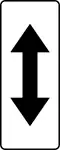 T-6b: tabliczka wskazująca układ dróg podporządkowanych (umieszczana na drodze z pierwszeństwem) | Tabliczka, umieszczana na drodze z pierwszeństwem, wskazuje niesymetryczny układ dróg podporządkowanych po obu stronach drogi z pierwszeństwem. Stosowana ze znakami A-6a skrzyżowanie z drogą podporządkowaną występującą po obu stronach i D-1 droga z pierwszeństwem. | ||||||||||||||||||||