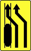 T-8: tabliczka wskazująca miejsce, w którym ruch pojazdów został skierowany na tory tramwajowe | Tabliczka wskazuje miejsce, w którym pas ruchu jest skierowany na torowisko tramwajowe. Stosowana ze znakami A-21 tramwaj lub A-30 inne niebezpieczeństwo. | ||||||||||||||||||||