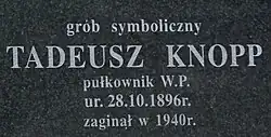 - ↑ Różne źródła podały inne miejsce urodzenia Tadeusza Knoppa. Ludwik Głowacki w publikacji pt. „Działania wojenne na Lubelszczyźnie w 1939 roku”. podał Borszczów, zaś wskazał Narajów. Obie miejscowości są położone na obszarze obecnej Ukrainy (wcześniej II Rzeczpospolita) w obwodzie tarnopolskim.