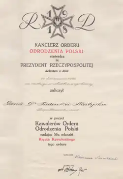 - Krzyż Kawalerski Orderu Odrodzenia Polski (10 listopada 1938)[11]