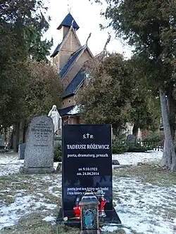 Tadeusz Różewicz zmarł 24 kwietnia 2014 we Wrocławiu[17]; pogrzeb odbył się 29 kwietnia 2014[18] i zgodnie z wolą poety spisaną w testamencie jego prochy zostały złożone na cmentarzu przy kościele ewangelickim Naszego Zbawiciela w Karpaczu[19].