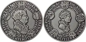 - ↑ Janusz Kurpiewski, Katalog monet polskich 1506–1573, Warszawa: Polskie Towarzystwo Numizmatyczne, Zarząd Główny, 1994, s. 33–35, ISBN 83-85057-24-2.