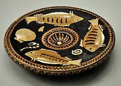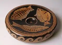 W opracowaniach archeologicznych naczynia tego typu nazywane są talerzami rybnymi, ze względu na motywy dekoracyjne, którymi były ozdabiane, tzn. ryby i zwierzęta morskie. Talerze rybne charakteryzowały się spłaszczonym, okrągłym kształtem i zagłębieniem w środku, w którym zapewne zbierał się sos lub inny płynny dodatek. Miały wywinięty na zewnątrz pod kątem prostym i opadający do dołu brzeg. Posiadały niską stopkę. Forma attycka w technice czarnopokostowej pojawiła się pod koniec V w. p.n.e. i była wytwarzana aż do II–I w. p.n.e. Formy południowoitalskie różniły się od pierwowzorów attyckich[1].