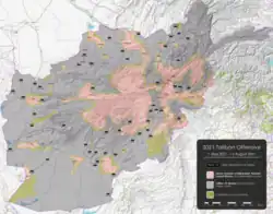 Równocześnie szybko umacniała się władza talibów. Na początku sierpnia 2021 talibowie posiadali ponad 200 z 407 dystryktów (powiatów) w Afganistanie i prowadzili walkę w 110 kolejnych[14]. 15 sierpnia przejęli Kabul i kontrolowali większą część kraju[15]. Po 9 dniach ofensywy Islamski Emirat Afganistanu zdobył kontrolę nad około 95% terytorium Afganistanu. Pozostałe terytoria (mniej niż 5%) kontrolują uznawane na arenie międzynarodowej władze. Ostatnią prowincją, gdzie siły rządowe stawiają opór wobec talibów jest Pandższir[16].