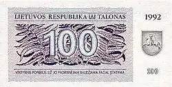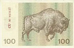 - 100 talonów (herb Litwy, mlecze/żubr).