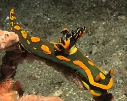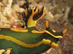 Ślimak o wydłużonym ciele osiągającym do 45 mm długości. Powierzchnia ciała jest gładka[2]. Podstawowa barwa ciała jest ciemnozielona do niemal czarnej z występującymi na niej jaskrawożółtymi wzorami[1][3]. Rinofory są jaskrawożółte, a ich osłonki ciemnozielone. Na grzbietowej stronie przodu ciała leżą dwie jaskrawożółte łaty – jedna między rinoforami, a druga bliżej skrzeli. Jaskrawożółta przepaska biegnie brzegiem listwy frontalnej, przechodząc na boki, gdzie biegnie jako para pasów podłużnych, które za skrzelami wchodzą na środek grzbietu. Para szerokich, jaskrawożółtych przepasek obejmuje czułki gębowe, biegnąc bokami ciała niżej od poprzedniej i sięgając do końca ogona; w tyle poprzerywana. Kolejna para szerokich przepasek tejże barwy biegnie jeszcze niżej wzdłuż krawędzi nogi. Poza tym barwę jaskrawożółtą mają: opaska wokół skrzeli, linie na zewnętrznej stronie osi skrzeli oraz nieregularne plamy w tylnej części ciała[1]. Miejscami barwa jaskrawożółta przechodzić może w jaskrawą, niebieskawą zieleń, zwłaszcza na osiach skrzeli[3].