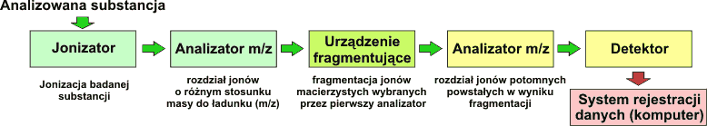 W tandemowych spektrometrach mas stosowane są różne metody fragmentacji jonów. Najczęściej używane są: