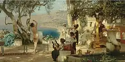 - ↑ Taniec wśród mieczy, olej olej na płótnie, 77 x 155 cm, obraz sygnowany i datowany: l.d. H Siemiradzki - Roma 1887