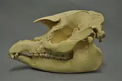 Czaszka ma bardzo wysoką koronę; kości nosowe wyłaniają się wysoko ponad dno jamy nosowej; profil grzbietowy, od nosa do potylicy, jest prosty; górne linie skroniowe nie spotykają się, a znajdująca się między nimi płyta grzbietowa jest niska i szeroka; potylica jest szeroka i pionowa[41]. Podobnie jak u gatunków z rodzaju Tapirus, chrzęstna przegroda nosowa jest mała i znajduje się w szczelinie pomiędzy dwoma szczękami[41]. Wgłębienia grzbietowe nosa tworzą głębokie, szerokie kanały, które są przedłużone z powrotem do przednich kości jako para bocznych, spiralnych zwojów[41]. Widoczny jest guzek czołowo-łzowy[41]. Przednie zęby przedtrzonowe nie są dobrze wykształcone; górne zęby trzonowe mają szerokie przednie i tylne obręcze[41]. Przednie końce kości przedszczękowych zakrzywiają się w dół, tak że siekacze zgryzają się na poziomie znacznie poniżej linii zgryzu zębów policzkowych[41]. Wzór zębowy u dorosłych tapirów to I C P M = 42[42].