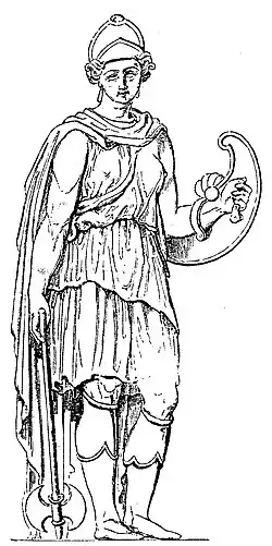Wykonana z wikliny i obciągnięta skórą, miała charakterystyczny kształt zbliżony do półksiężyca. Jako broń defensywna przypisywana też legendarnym wojowniczkom Amazonkom. Motyw tej tarczy stał się elementem zdobniczym, pojawiającym się na wyrobach ceramiki antycznej.