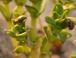 Zarówno osobniki dorosłe jak i larwy tego tarczyka są fitofagami żerującymi na roślinach z rodziny goździkowatych. Wśród ich roślin żywicielskich wymienia się honkenię piaskową, lepnicę białą, gwiazdnicę trawiastą oraz gwiazdnicę wielkokwiatową. Najliczniej zasiedla piaszczyste wybrzeża mórz[6][5].