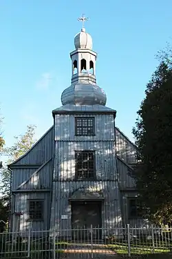 Pierwszy tutejszy kościół drewniany powstał tu ponoć w 1293 r.; byłby więc najstarszym w tej części Polski. W każdym razie istnienie parafii wzmiankowano w 1334 r. Kościół ów uległ spaleniu w 1740 i na jego miejsce w 1746 powstał obecny drewniany, z fundacji Bonifacego Brodowskiego, proboszcza i jednocześnie dziedzica wsi. Odnawiany w 1858 i 1923/26 roku[10].