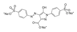 Tartrazyna (żółcień spożywcza 5, E102) – organiczny związek chemiczny, cytrynowożółty barwnik azowy produkowany głównie do celów spożywczych. Należy do syntetycznych barwników kwasowych z grupy barwników pirazolowych (pirazolonowych). Jako pierwsi otrzymali ją J.H. Ziegler i M. Locher w 1884 roku[2] i był to pierwszy uzyskany pigment pirazolonowy[1][3]. Jest dopuszczona do użytku przez amerykańską agencję FDA (mimo tego jest zakazana w niektórych krajach), która wymaga umieszczenia na opakowaniach produktów zawierających ten związek adnotacji FD&C No. 5 (Stany Zjednoczone nie stosują symboli E).