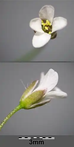 - Drobne kwiaty tworzą długie grono w górnej, nieulistnionej części łodygi. W szczytowej części jest ono bardzo gęste, niżej rzadkie[14]. W czasie owocowania zarówno oś kwiatostanu, jak i szypułki kwiatowe wydłużają się[6]. Cztery działki kielicha są skośnie odstające[14], zielone lub czerwonawe, biało obłonione na brzegu[9], owłosione, długości ok. 1 mm[6] (ew. 2[9]–2,2 mm[10]). Cztery płatki korony białe, rzadziej różowe[14][13] lub żółtawe[9], jajowate, o długości zwykle 2–2,2 mm[6] (ew. do 3[10]–4 mm[9]). Czasami brak płatków korony[10]. Działki kielicha i płatki korony ustawione są względem siebie na krzyż[15]. Pojedynczy, górny słupek z szyjką długości 0,5 mm[10] otoczony jest przez 6 pręcików czterosilnych[15]. Nitki pręcików są białe, długości 1–2 mm. Jajowate pylniki mają długość do 0,5 mm[9].