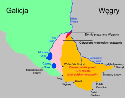 Nie zawsze jednak tak było. Tatry od samego początku stanowiły naturalną granicę między Polską a Królestwem Węgier. Od czasów Mieszka II (1031 r.) granica ustaliła się w ten sposób, że Podhale należało do Polski, a Orawa, Liptów i Spisz do Węgrów. Przez długi czas jednak granica ta nie była dokładnie wyznaczona, nie było też dokładnych map Tatr i początkowo stanowiły one pas ziemi niczyjej[3]. W miarę jak osadnictwo w otaczających Tatry regionach Podhala, Spiszu, Orawy i Liptowa posuwało się ku podnóżom Tatr, a w Tatrach rozpoczęto wydobywanie rud metali, wypas i wyrąb drzewa, coraz dokładniej kształtowała się granica między Polską i Węgrami, powstawały też spory graniczne. W 1634 r. podpisano umowę pomiędzy Polską i Węgrami wyznaczającą granicę w Tatrach. Biegła ona wówczas rzeką Białką i potokiem Biała Woda na Mały Jaworowy Szczyt, a dalej główną granią przez Polski Grzebień, Zadni Gerlach, Rysy, Mięguszowieckie Szczyty, Szpiglasowy Wierch. W 1772, po I rozbiorze Polski większa część Tatr stała się własnością Monarchii Habsburgów i weszła w skład Galicji, natomiast część Tatr w obrębie Spiszu Austria przekazał królestwu węgierskiemu. W 1782 roku Austriacy sporządzili pierwszą dokładną (jak na ówczesne czasy) mapę Tatr[1].