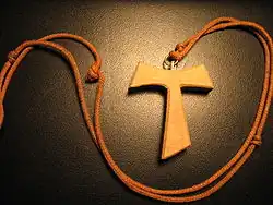 - W religii chrześcijańskiej krzyż tau τ często łączony jest z osobą Jezusa Chrystusa, bądź też z duchowością Tau. Jej pierwotna forma przypominała X, bądź + i była często używana jako osobisty podpis czy znak pieczętujący dokument lub własność. „Mój podpis” w Hi 31,35 dosłownym tłumaczeniu brzmi „moja tau”. Szkocki protestancki bp. Alexander Hislop, w nieco kontrowersyjnym tekście, dopatruje się krzyża tau w religii Babilonu np. w kontekście Tammuza[1]. W kulturze grecko-rzymskiej ten znak zbawienia wyrażał liczbę 300. τ była też używana jako znak magiczny, chroniący od zarazy i demonów, umieszczano ją na amuletach, na murach domów. Później używali jej bracia szpitalni św. Antoniego Pustelnika (stąd nazwa krzyż św. Antoniego). Znany też jako krzyż egipski czy crux commissa. Znak τ przyjął i używał św. Franciszek podczas Soboru Laterańskiego IV, pod wpływem mowy papieża Innocentego III, nawiązującej do widzenia Ezechiela (Ez 9,4-6) i zawierającej wezwanie „bądźcie więc bojownikami τ i krzyża”. Innocenty III, wyrażał jednocześnie przekonanie, że tak właśnie wyglądał krzyż Zbawiciela, zanim Poncjusz Piłat przybił do niego tabliczkę z napisem: Jezus Nazarejczyk, Król żydowski (J 19,19). Dzisiaj używany powszechnie przez członków zakonów i zgromadzeń franciszkańskich, zawieszony na sznurku lub rzemyku z trzema węzełkami.
