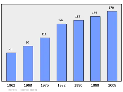 Według danych na rok 1990 gminę zamieszkiwało 156 osób, a gęstość zaludnienia wynosiła 35 osób/km² (wśród 2880 gmin regionu Rodan-Alpy Tauriers plasuje się na 1466. miejscu pod względem liczby ludności, natomiast pod względem powierzchni na miejscu 1559.).