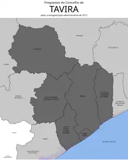 Do 2012 gmina Tavira była podzielona na 9 sołectw (port. freguesias), jako jednostek administracyjnych niższego rzędu.