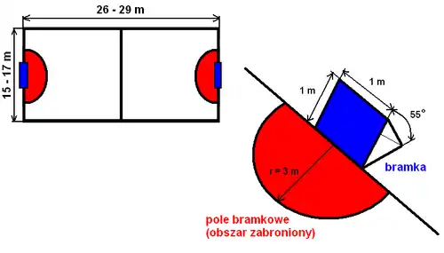 Na obydwu końcach boiska (krótszych bokach) ustawione są ramy z naciągnięta siatką pełniące rolę bramek, od których odbijana jest piłka. Bramki mają kształt kwadratu o boku 1 m i są ustawione pod kątem 55 stopni do podłoża. Przed bramkami znajdują się półokręgi o promieniu 3 m, stanowiące obszar zabroniony (tzw. obszar "D" lub pole bramkowe). Zawodnik, który trzymając piłkę dotknie stopą obszaru zabronionego popełnia błąd skutkujący utratą piłki na rzecz drużyny przeciwnej. Zawodnik może przebywać w strefie zabronionej tylko bezpośrednio po oddaniu rzutu na bramkę lub podaniu piłki. W szczególności, przechodzenie przez strefę zabronioną w celu przyjęcia pozycji do obrony jest niedozwolone.