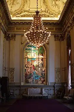 Halę wejściową zdobi kopuła ozdobiona ogromnym witrażem[6]. Foyer udekorowano czterema rodzajami marmuru sprowadzonego z Europy[6].
