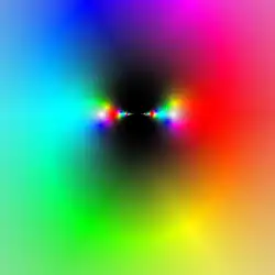 - Środek płaszczyzny zespolonej jest czarny, liczba 1 jest błękitno turkusowa, liczba −1 jest czerwona a punkt w nieskończoności jest biały.