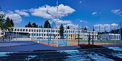 ![]() Główne wejście do budynku szkolnego. Nie są widoczne skrzydło warsztatowe i budynek internatu. | |