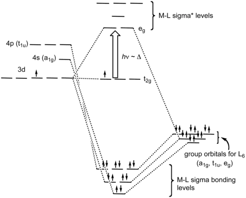 Orbitale molekularne tworzone przez proces koordynacji mogą zostać rozpatrzone jako efekt przekazania dwóch elektronów do orbitali d metalu przez każdy z σ-donorowych ligandów. W kompleksie oktaedrycznym ligandy ustawiają się (po przyłożeniu kartezjańskiego układu współrzędnych) wzdłuż każdej z osi współrzędnych. Dlatego też ich orbitale o symetrii σ tworzą orbitale wiążące i antywiążące z orbitalami atomowymi dz2 oraz dx2−y2. Orbitale dxy, dxz oraz dyz pozostają niewiążące. Ponadto możliwe jest występowanie słabych oddziaływań wiążących lub antywiążących z orbitalami s oraz p metalu.