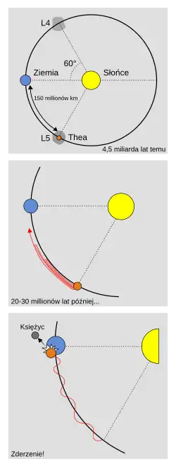 Według tej hipotezy Thea uformowała się w punkcie libracyjnym Ziemi, to znaczy na tej samej orbicie, ale około 60° przed lub za Ziemią. Kiedy protoplaneta Thea urosła do rozmiarów Marsa, jej masa stała się za duża, aby mogła utrzymać stabilne położenie względem Ziemi. Wtedy odległość kątowa między Ziemią i Theą zaczęła podlegać coraz większym oscylacjom, aż w końcu nastąpiło zderzenie.