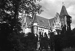 Na przełomie XIX i XX wieku Cezary Olesza postanowił wznieść tu wielki, neogotycki pałac. Zaprojektował go Julian Lisiecki. Budynek został ukończony w 1908 roku. Mimo że był zaprojektowany na planie prostokąta, wielka liczba wież, wieżyczek i krenelaży tworzyła bardzo zróżnicowaną bryłę[6].