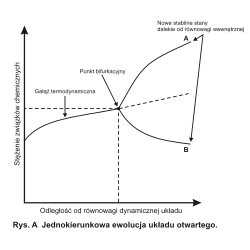 Dalekie od równowagi wewnętrznej układy dynamiczne stają się w miarę oddalania od równowagi coraz bardziej niestabilne. Układ, który opuścił stan równowagi dynamicznej (homeostazy, wewnętrznej), zmienia swe parametry, dochodząc do stanu stabilnego. Układy tego typu podążają początkowo jedną ścieżką i osiągają zawsze taki sam stan stabilny. Gdy odchylenie od stanu równowagi jest większe, układ może osiągnąć jeden z dwóch stanów stabilnych (rys. A), gdy odchylenie jest jeszcze większe układ ścieżki zmian układu pod wpływem minimalnego bodźca mogą z kolei rozdzielić się na liczne inne stany (rys. B) (np. Odwzorowanie logistyczne).