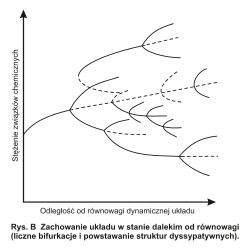 Poprzez serię bifurkacji (rys. B) układ może przejść do nowego stanu stabilnego nazywanego strukturą dyssypatywną.