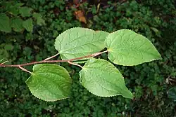 - Skrętoległe, zrzucane przed zimą[6]. Ogonek liściowy ma 2–4 cm długości. Blaszka liściowa jest szerokojajowata, cienka, u nasady sercowata do zaokrąglonej, na wierzchołku zaostrzona, na brzegu piłkowana, osiąga 7–16 cm długości i 4–12 cm szerokości. Użyłkowanie jest dłoniaste, z 5–7 wyraźnymi głównymi wiązkami przewodzącymi. Od spodu liście są jaśniejsze[5].