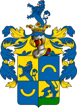 Tarcza czwórdzielna w krzyż. W polu I złotym pół lwa błękitnego, w polu II błękitnym półpierścień złoty, w polu III błękitnym dolne pół pierścienia złotego, w polu IV złotym dolna połowa lwa błękitnego na murawie zielonej. W klejnocie pół lwa jak w godle. Labry błękitne, podbite złotem.
