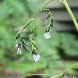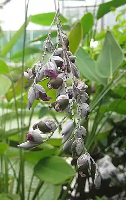 - Kwiaty rosną w parach[7] w zredukowanych wierzchotkach[8] zebranych w rozgałęzione kwiatostany, o osiach drugiego rzędu krótkich i wzniesionych (kwiatostany wielkości 31 cm[7]) do długich i wygiętych (kwiatostany wielkości 1 metra[7])[6], szeroko rozpostarte do zwisających i przypominających wiechę[7]. Międzywęźla kwiatostanu wyraźnie zygzakowate[7]. Każda para kwiatów wsparta jest podsadką, zielną do skórzastej[6], długości do 2,8 cm[7], odpadającą w czasie zawiązywania owoców[6]. Listki wewnętrznego okółka okwiatu zrośnięte w rurkę na długości 1–6 mm, blado- do ciemnofioletowych, nierówne lub silnie nierówne[6]. Listki zewnętrznego okółka błoniaste, trwałe, długości do 2,5 mm[7]. Zewnętrzny prątniczek długości do 2 cm, lawendowy do ciemnofioletowego, przypominający listek okwiatu, efektowny[6][7]. Guzowate prątniczki mięsiste, z wąsko zaostrzonym wierzchołkiem przypominającym listek okwiatu[6], u nasady białe, żółte lub fioletowe[7]. Jeden prątniczek kapturkowaty, z dwoma wyrostkami przypominającymi palce[6] u nasady[8]. Jeden pręcik z pojedynczym pylnikiem[8]. Zalążnia zbudowana z trzech owocolistków, funkcjonalnie jednokomorowa, z jednym, anatropowym zalążkiem[8]. Szyjka słupka u nasady zrośnięta z rurką okwiatu, z jednym wyrostkiem, wydłużona, paskowata, po dotknięciu zwijająca się spiralnie[6], co jest wyjątkowe w rodzinie marantowatych[8].